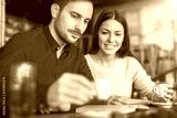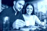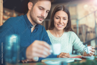 Young couple drinking coffee and reading a book in the cafe. Edu
