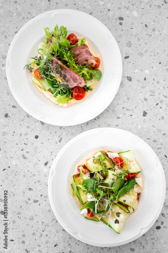 A minimalist presentation of two fresh salads on light grey speckled stone. One features greens and cherry tomatoes, while the other showcases zucchini, herbs, and creamy dressing.