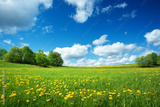 Field with dandelions and blue sky