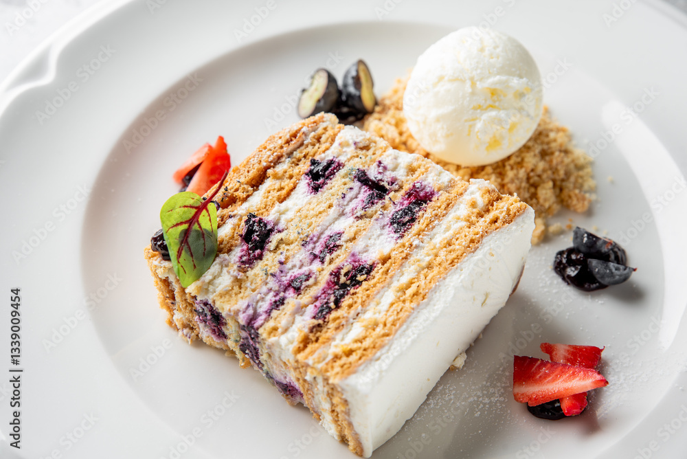 A delicious slice of layered cake with a creamy filling and blueberry pieces, accompanied by a scoop of vanilla ice cream, garnished with fresh berries and crumbs.