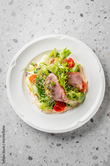 A vibrant salad featuring fresh greens, cherry tomatoes, and slices of meat arranged beautifully on a white plate, garnished with herbs for a colorful presentation.