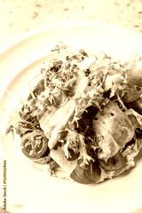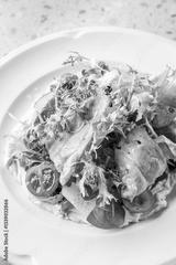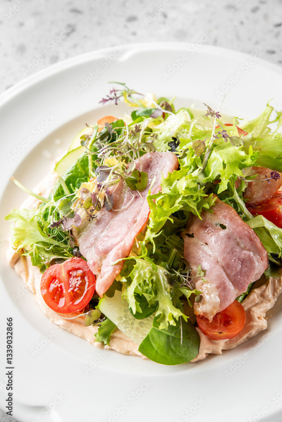 A vibrant salad featuring fresh greens, cherry tomatoes, and slices of meat arranged beautifully on a white plate, garnished with herbs for a colorful presentation.
