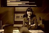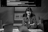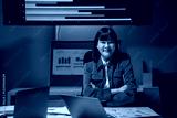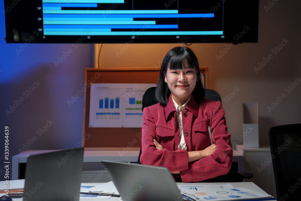 Confident Asian businesswoman standing with crossed arms, working late in illuminated office space filled with business analytics charts