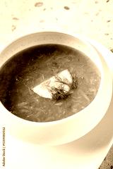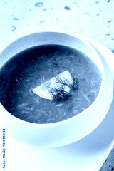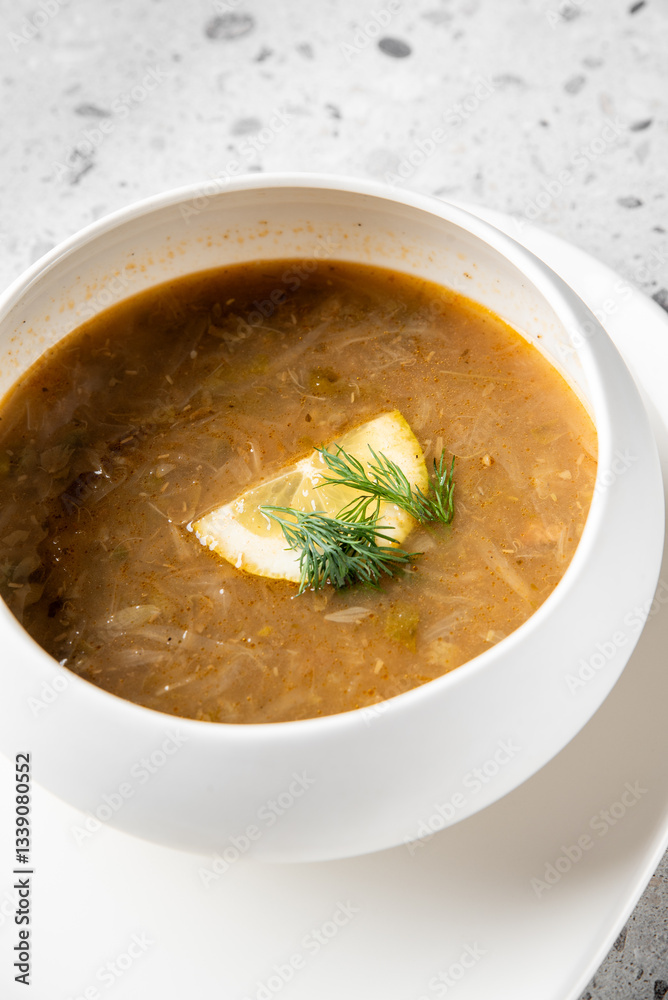 A close-up of a bowl of hearty soup featuring chunks of vegetables, a slice of lemon, and a sprig of dill, presented on a textured countertop, conveying comfort and warmth.