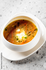 A bowl of warm, flavorful soup with vibrant vegetables and a creamy topping, set on a textured white surface. Ideal for culinary and food-related content.