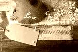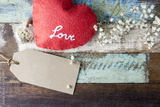 Love concept of blank brown paper tag with red heart and flowers on old wood for valentines day and wedding