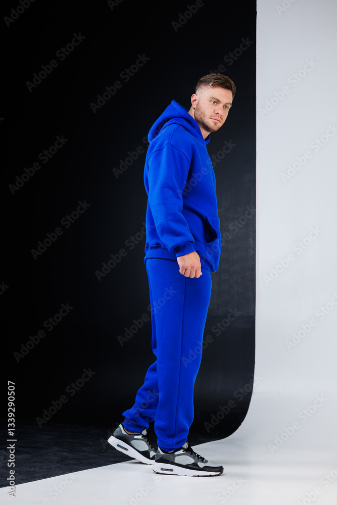 A man in a blue hoodie and sweatpants stands in front of a wall