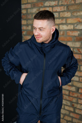 A man dressed in a blue jacket is standing in front of a brick wall
