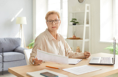 Concentrated elderly businesswoman focused on working with documents and a laptop at home office. Highlighting accounting, remote office tasks, and an audit in a domestic environment.