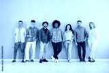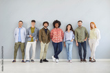 Group portrait of a multinational team of positive people standing together on a gray background. Community crowd, diversity, and unity within a happy and supportive group setting.