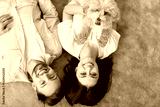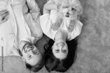 Happy childless childfree family couple with pet dog enjoying cozy relationship harmony. Indoor overhead shot from above smiling young man and woman lying on brown rug with little beige furry friend