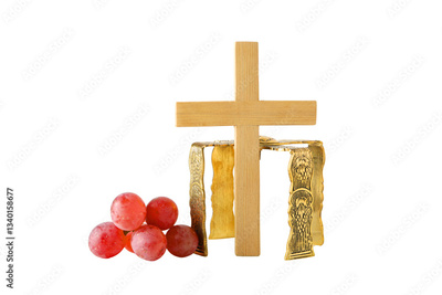 PNG, Eucharist, wooden cross on stand with grapes, isolated on white background