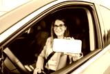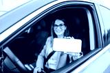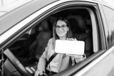 Close up of young woman sitting in her car and showing cellphone display at camera.