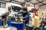 Young interracial workman attaching pump on oil barrel at auto mechanic workshop.