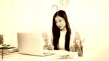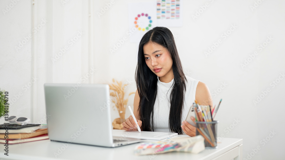 An asian woman is holding a stylus pencil drawing or writing on the tablet. Designer at work.