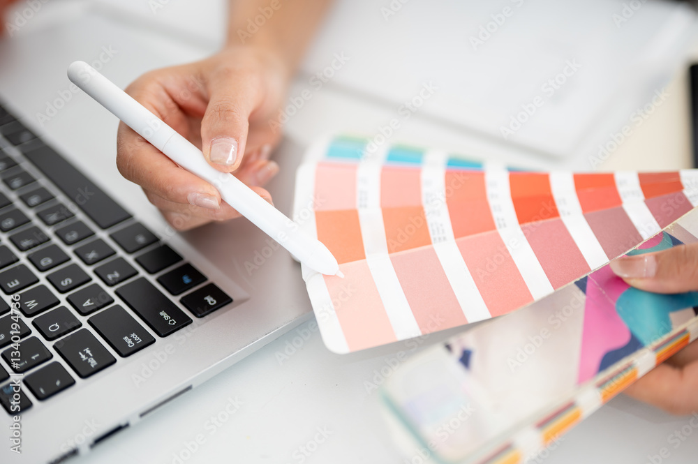 The hand holding a stylus pencil is choosing color from the printed color charts or color palettes.