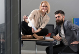 Flirty between colleagues. Office love story unfolding in secret. Flirting at the office. Office couple trying to hide their feelings. Office love. Harassment at workplace. Business romance.