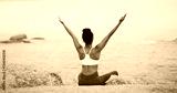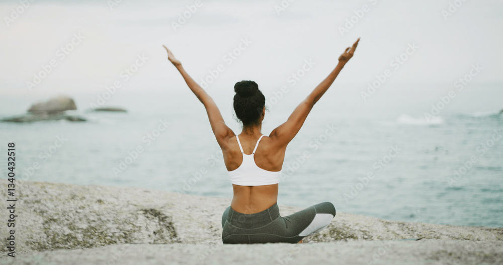 Ocean, freedom and meditation for woman, outdoor and spiritual practice for wellness, peace and relax. Sea, chakra and self awareness for person, back and yoga with mindfulness benefits or zen