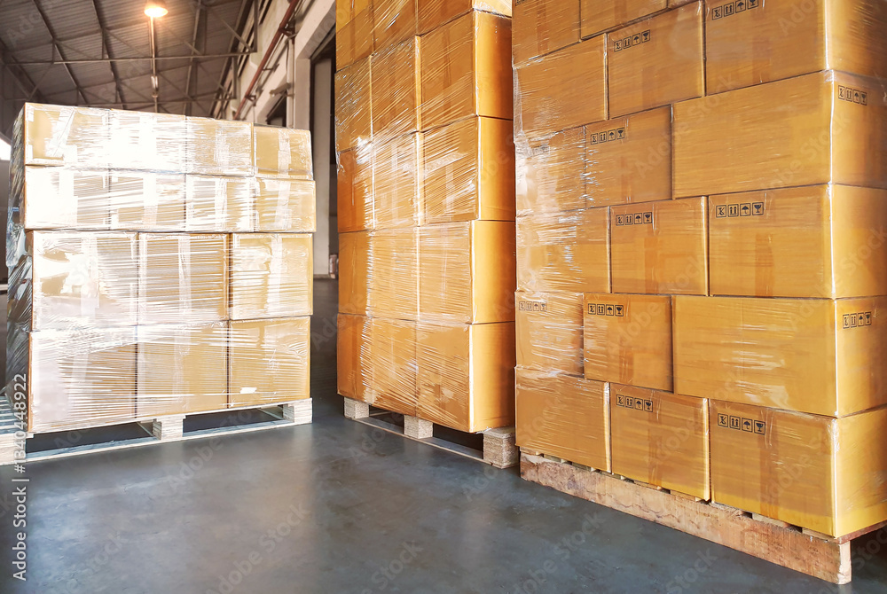 Bulk of Package Boxes Stacked on Pallets in Warehouse. Cartons, Cardboard Boxes. Storage Warehouse. Supplies Shipment. Supply Chain, Shipping Warehouse Logistics.