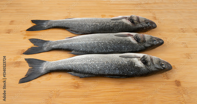 European seabass or Dicentrarchus labrax, whole raw labrax, branzino fish, European bass