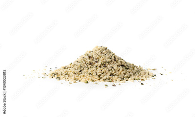 Shelled hemp seeds pile isolated, peeled cannabis grains, marijuana kernels without peel