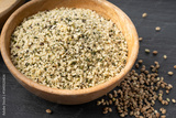 Shelled hemp seeds pile, peeled cannabis grains, marijuana kernels without peel