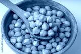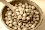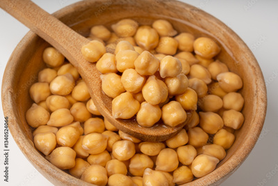 Soaked chickpeas, chick pea in water, swollen wet Cicer arietinum fruits, garbanzo beans cooking