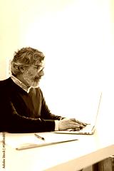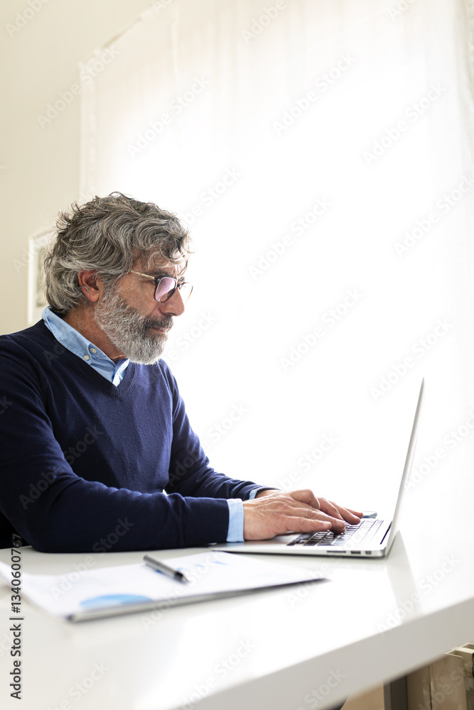 Side view vertical portrait of caucasian mature business man working with laptop at home office. Copy space.