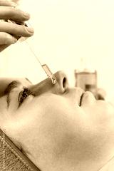 A beauty salon professional uses facial oil on a young female client. A drop close-up