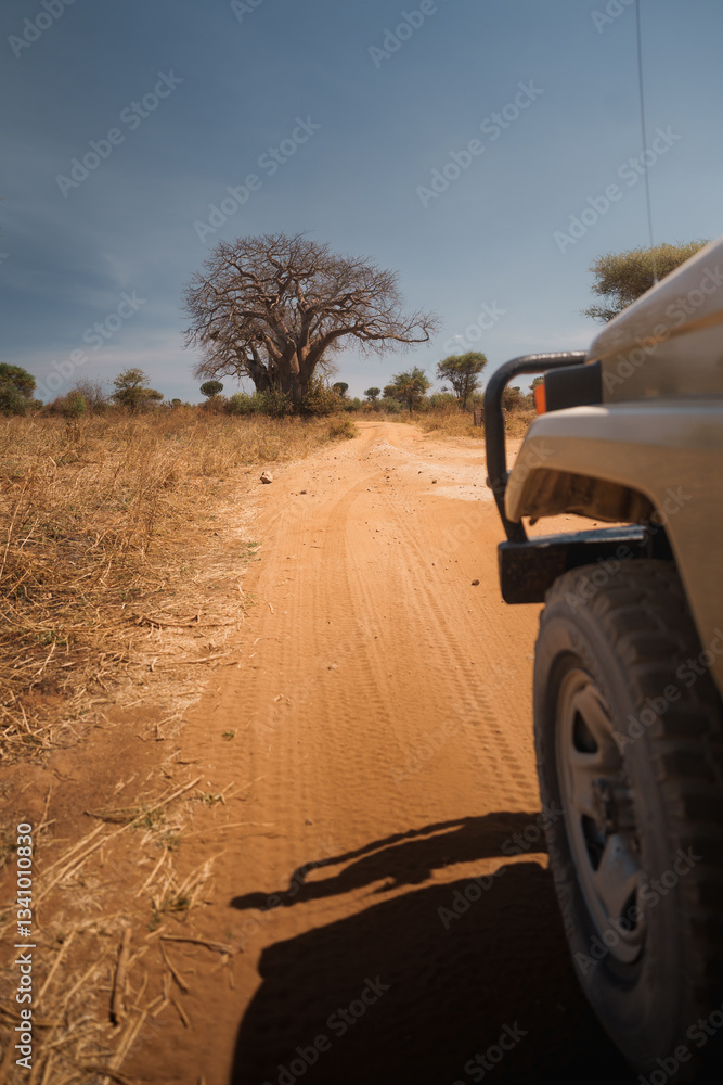 Safari jeep exploring tarangire national park, tanzania, africa, with baobab tree