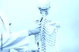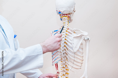 Closeup on medical doctor man pointing on cervical spine of human skeleton anatomical model. Selective focus