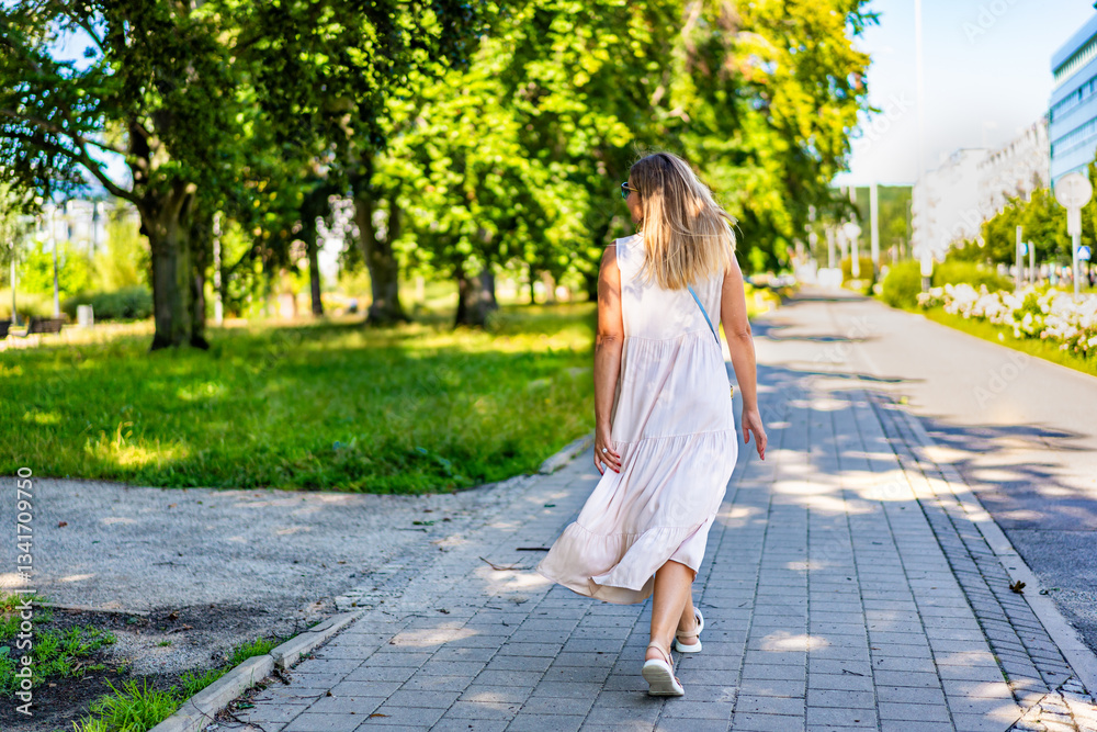 Beautiful middle-aged woman blonde walking in city park in summertime. Back view