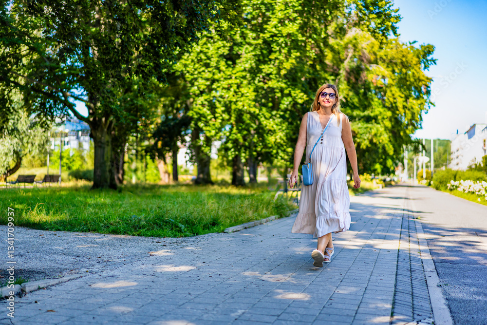 Beautiful middle-aged woman walking in city park in summertime. Front view