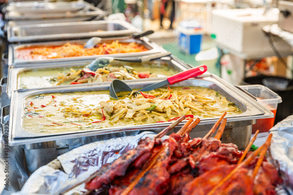 Delicious Asian street food market with takeaway meals, Thai food, food trucks