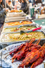 Delicious Asian street food market with takeaway meals, Thai food, food trucks