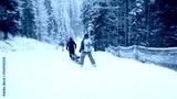 Mountain rescuers transporting an injured skier, going downhill after first aid. Slope rescue, ski patrol service evacuating the victim on a special sledge. Bukovel ski resort, ukraine carpathians.