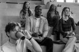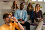 Diverse university students listening to a presentation in modern lecture hall