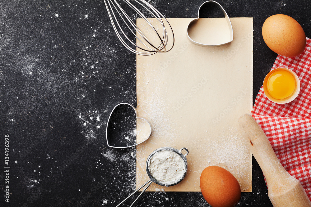 Baking background with flour, rolling pin, eggs, paper sheet and heart shape on kitchen black table from above for Valentines day cooking. Flat lay style.