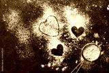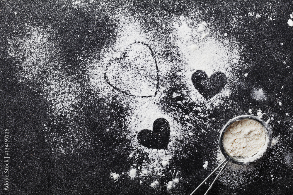 Baking background with flour and heart shape on kitchen black table from above for Valentines day cooking. Flat lay style.