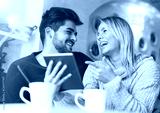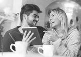 Loving couple sitting in the cafe, drinking tea and having fun w