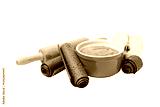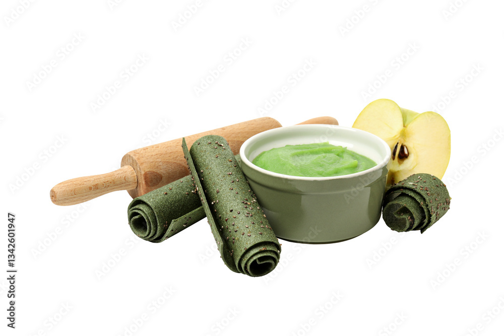 PNG, Three green rolls of fruit pastille, bowl with mashed fruit and piece of apple, isolated on white background