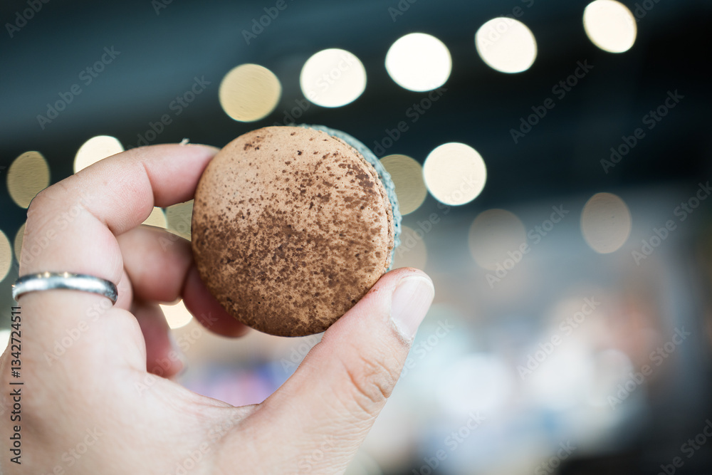 Delicious chocolate macarons on hand, perfect for dessert lovers enthusiasts.