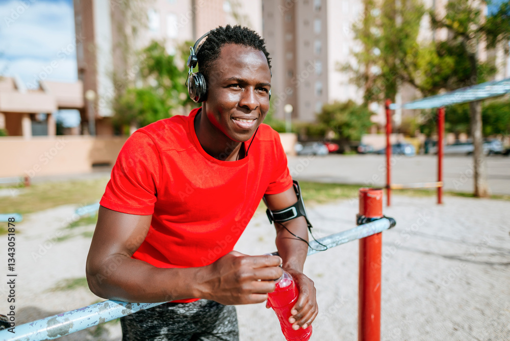 Sportsman drinking isotonic drink and listening music
