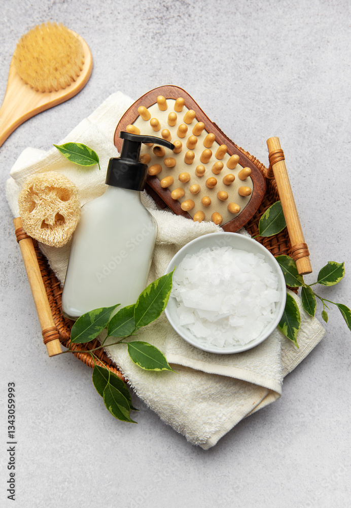 Magnesium flakes and eco friendly accessories creating relaxing spa setting