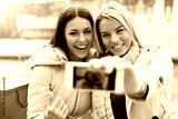 Beautiful smiling girls making a selfie after good shopping. Con