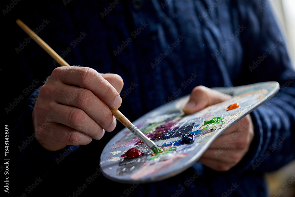 the artist holds a palette with paints and a brush and is going to paint on canvas