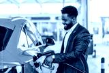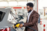 Smiling interracial man filling up car tank at gas station.