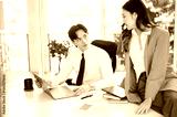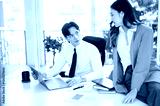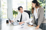 Asian male office worker is asking or talking with female coworker about the data on laptop screen.