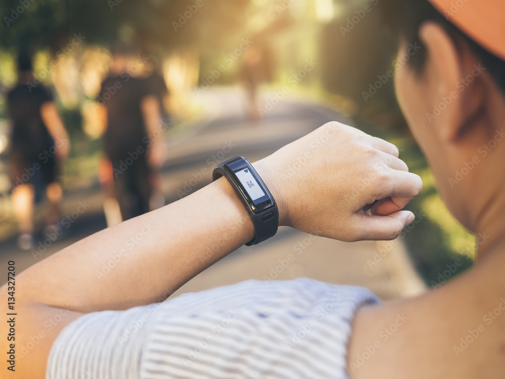 Woman checking Heart rate Exercise Outdoor with Smart watch