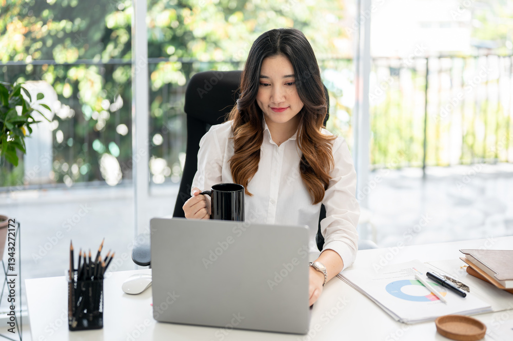 An asian businesswoman or female office worker holding coffee mug and looking at laptop in office.